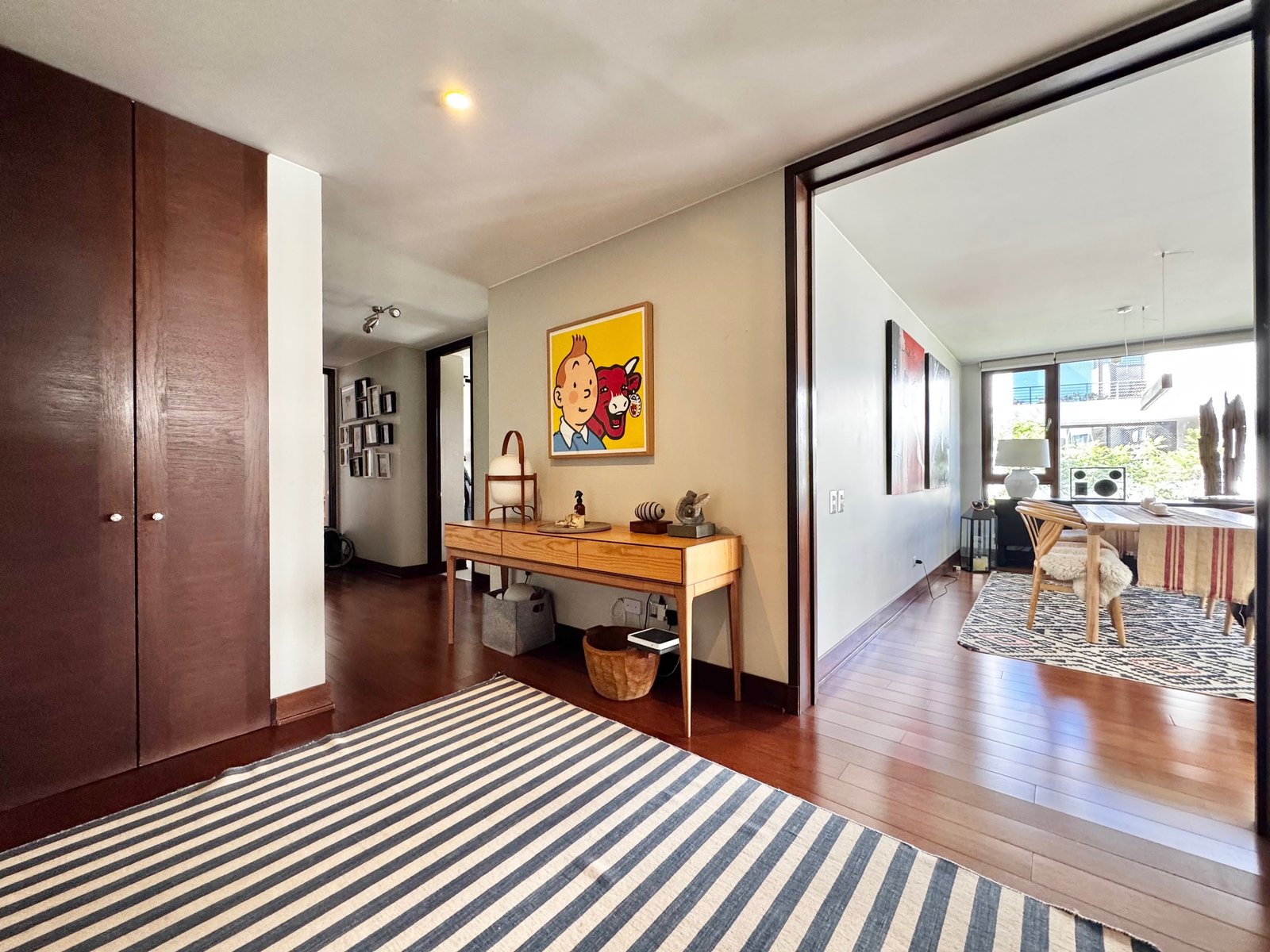 El departamento cuenta con dos estacionamientos ( en tandem ), una bodega, calefacción, ventanas termopanel, pisos de madera y porcelanato.