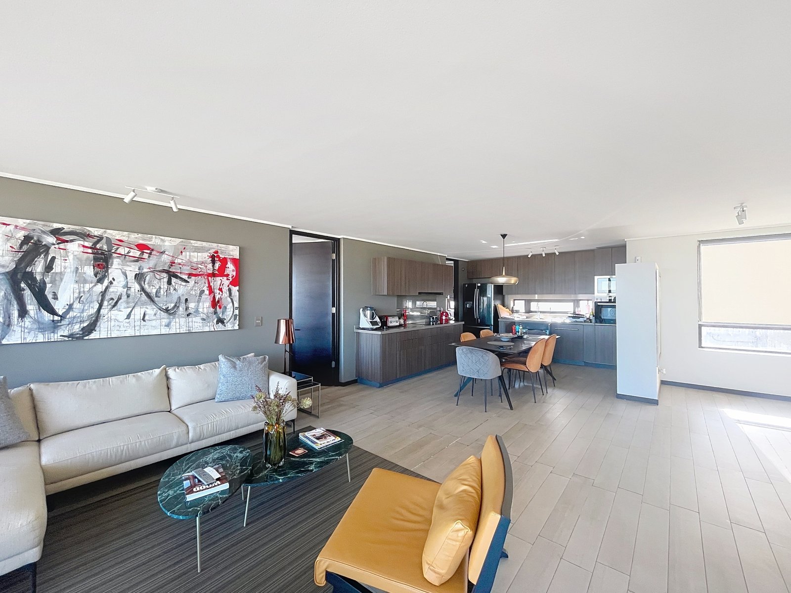 El departamento tiene una distribución tipo mariposa que separa el área de descanso de la parte social, asegurando privacidad y comodidad, con una gran terraza de 20 mts2 que permite disfrutar de la vista despejada invierno y verano.