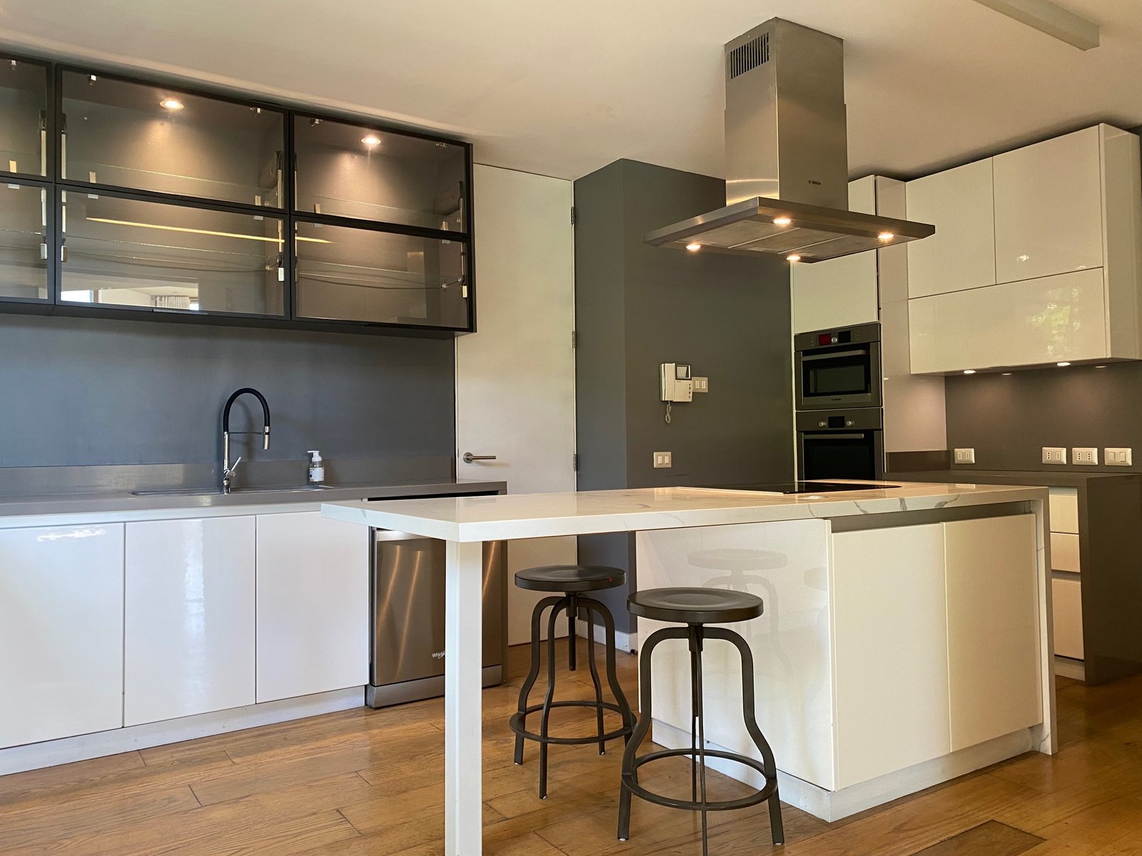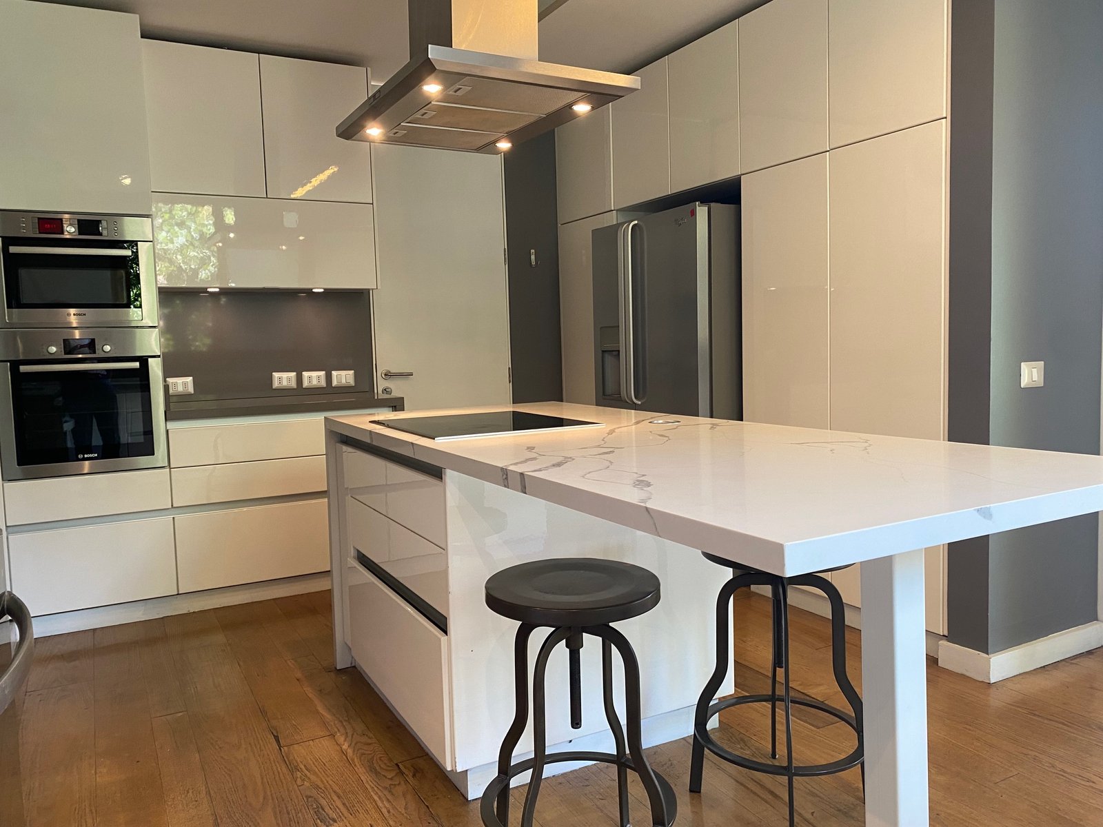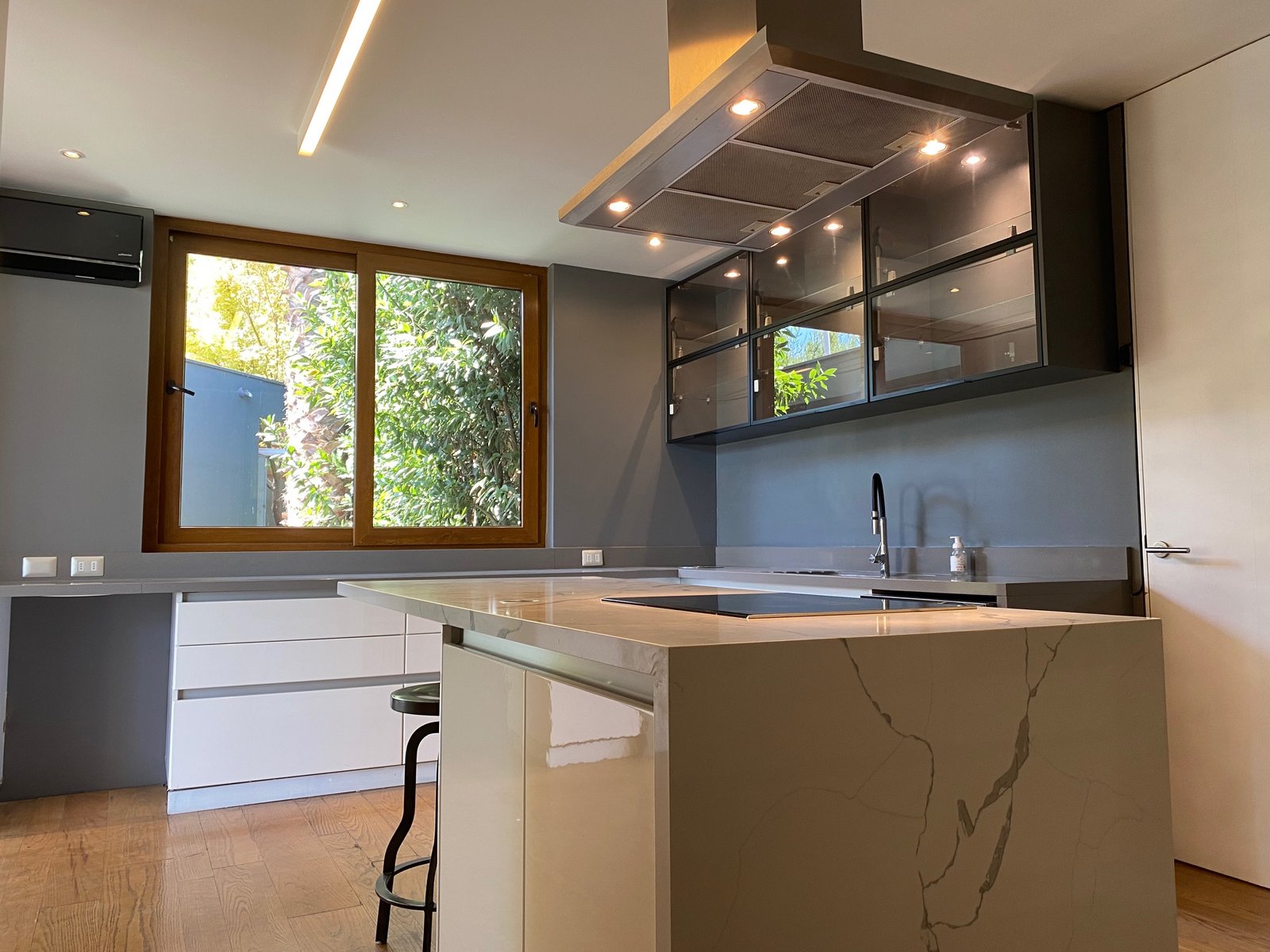 Cocina moderna, con mesón central tipo isla como comedor de diario. Además de numerosos espacios con muebles y excelente iluminación. Artefactos de cocina de primera línea.