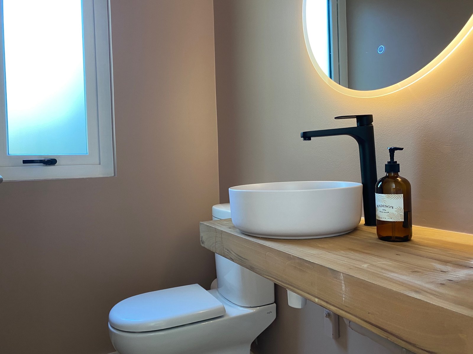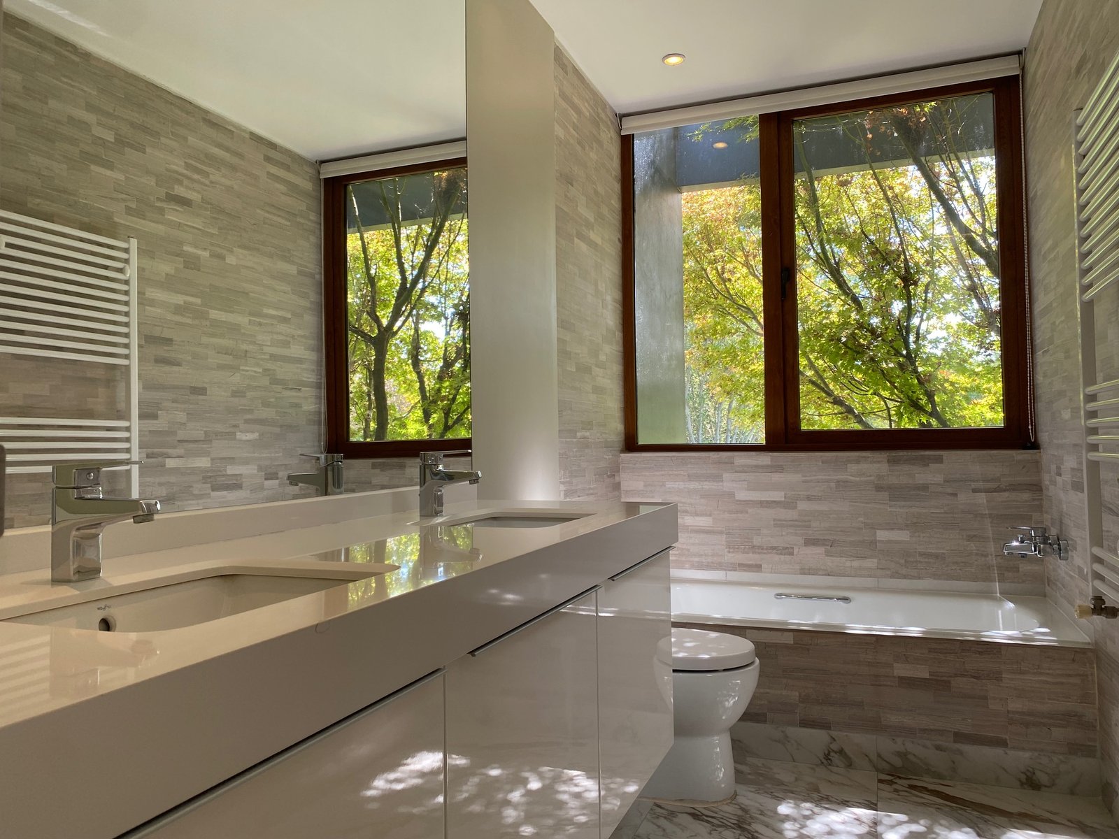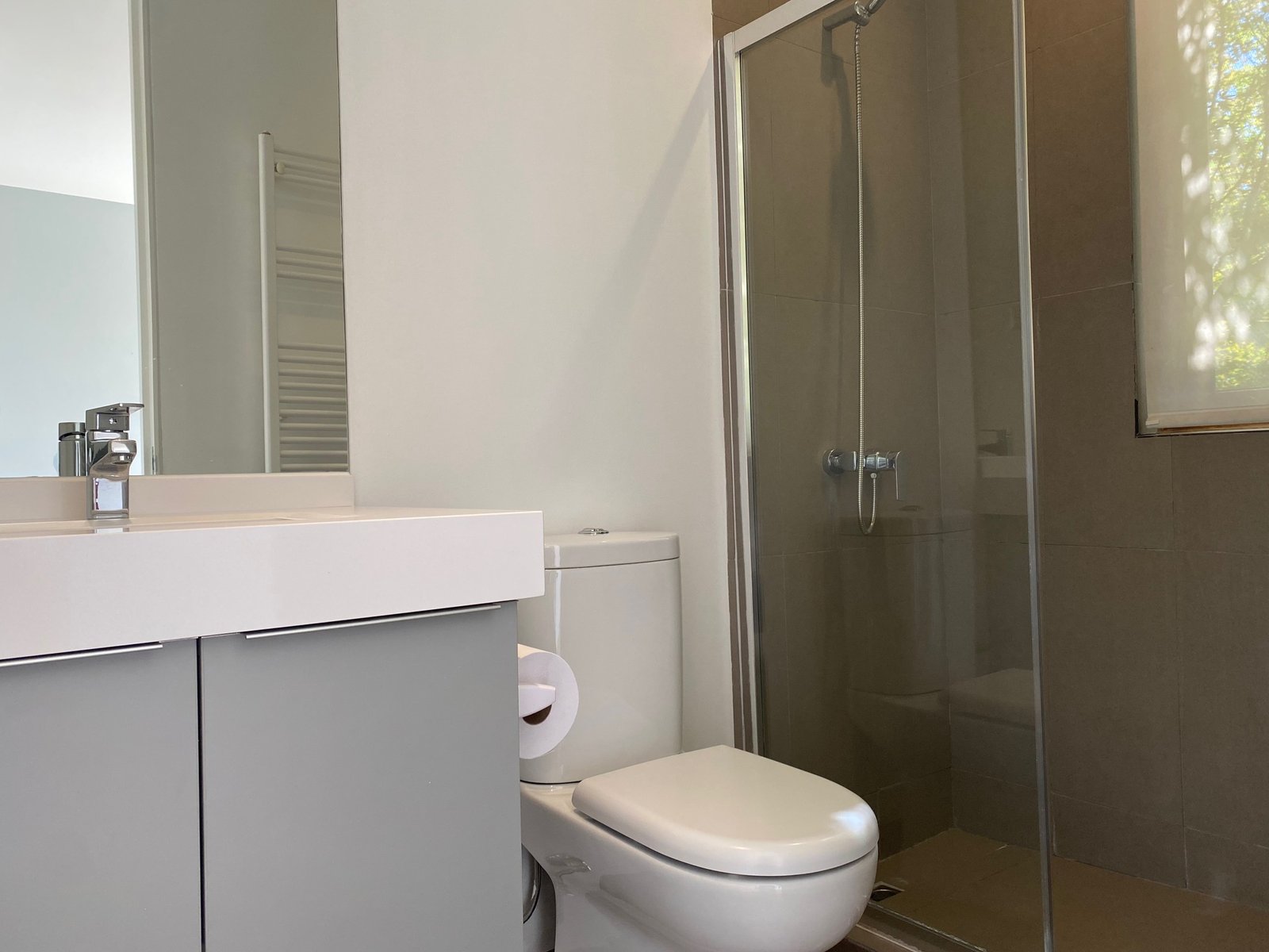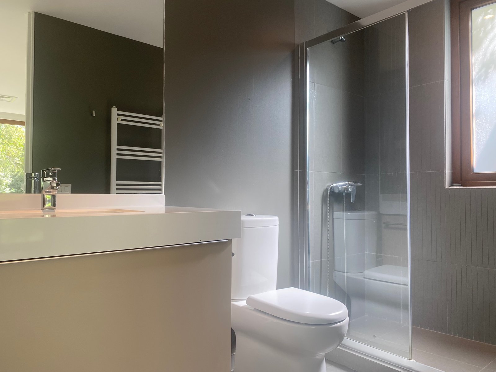 A un costado de la casa caminamos por pasillo y encontramos el dormitorio principal en suite con lindo baño con vista a verde. Puertas con salida desde el dormitorio al jardín. Buena cantidad de closets asi como buen tamaño del dormitorio.