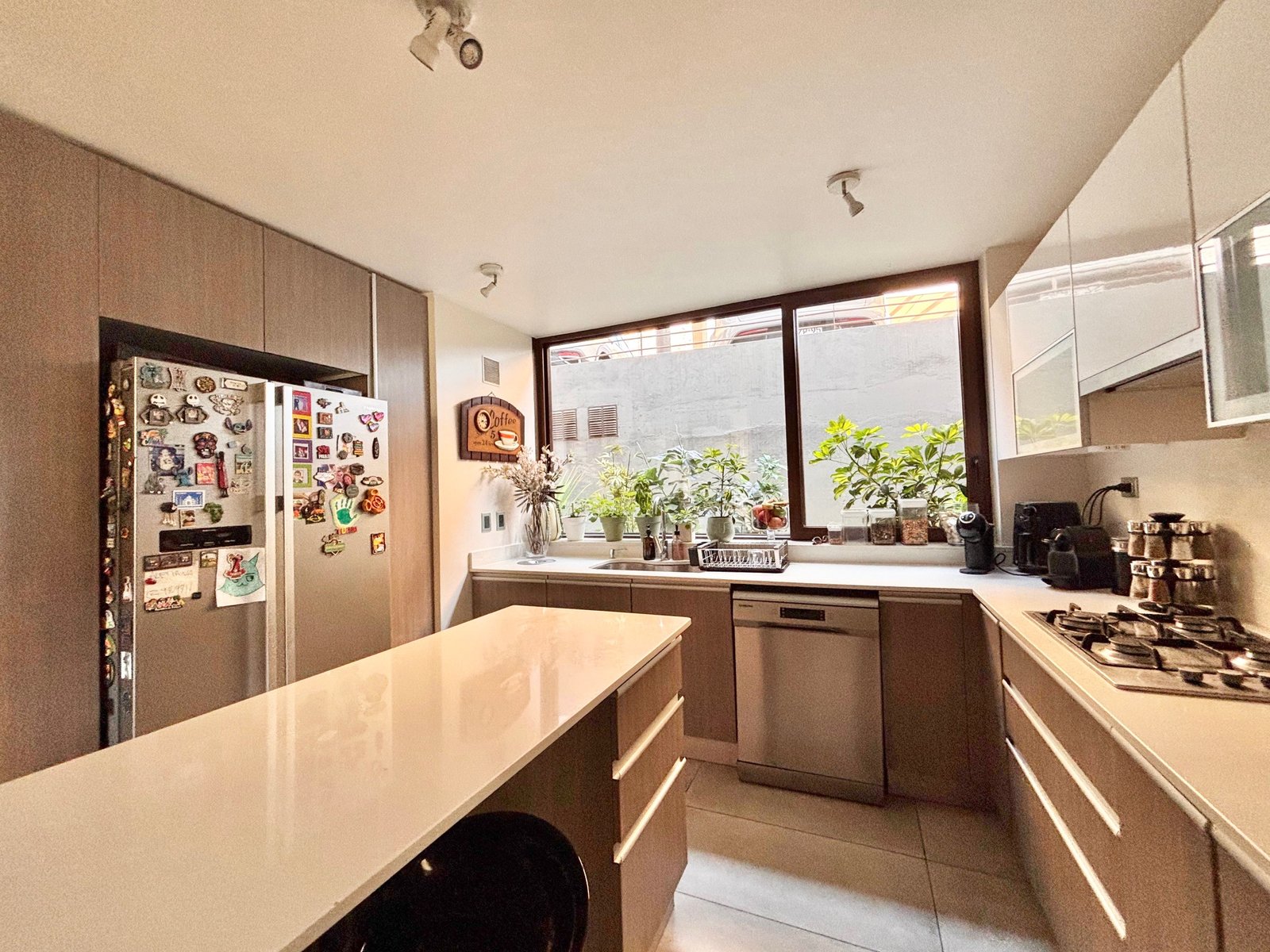 Cocina full equipada con mesón central y muy buenos espacios que permiten estupenda movilidad dentro de la cocina. Equipamiento empotrado.