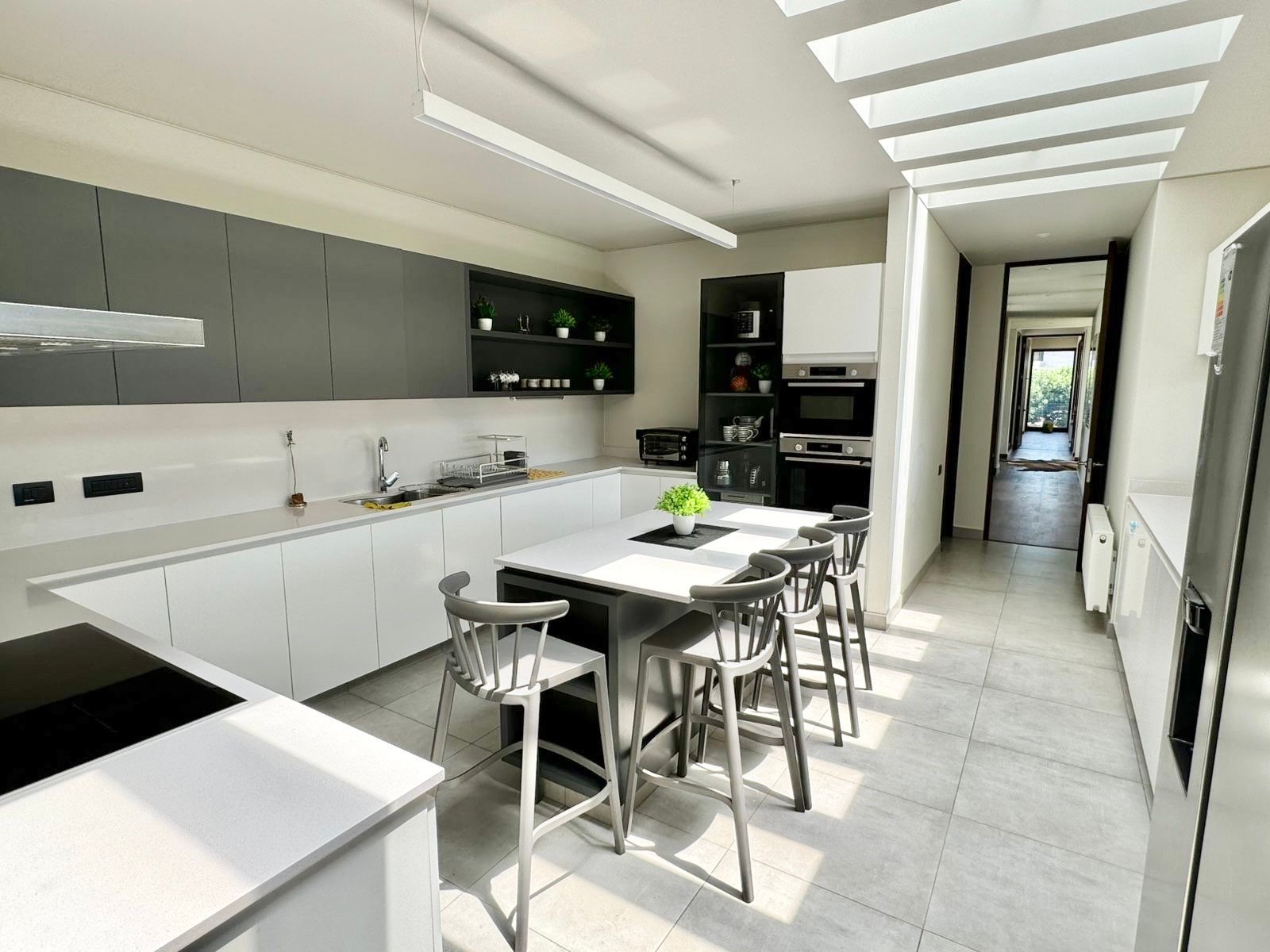 -Moderna cocina muy iluminada, con isla, cubiertas de Silestone y equipada con encimera, campana y hornos eléctrico y microondas empotrados. -Lavadero interior -Despensa -Servicios completos.