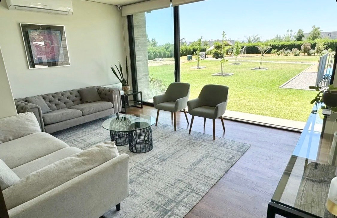 DETALLE EXTERIOR: -Hermoso Jardín con paisajismo -Terrazas techadas con ventiladores y cerradas con ventanales termopanel, lo que permite su uso durante todo el año.
