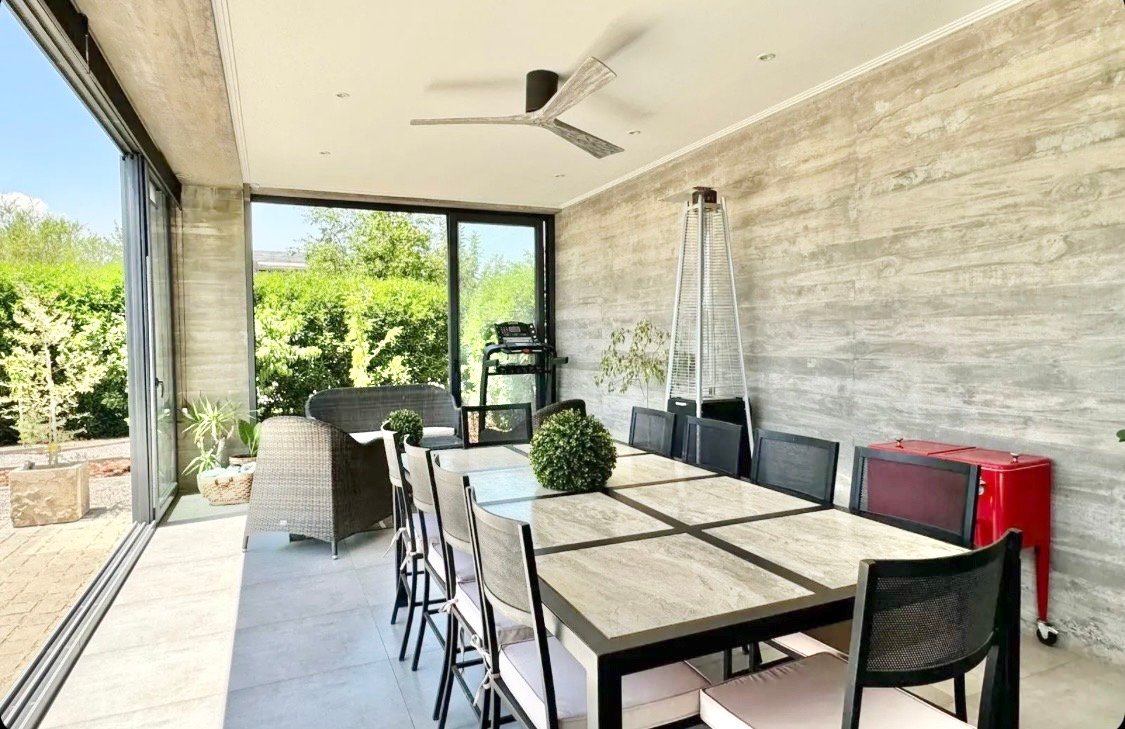 El diseño de la propiedad presenta líneas rectas y materiales contemporáneos, con amplios ventanales que permiten disfrutar de agradables vistas hacia el jardín.