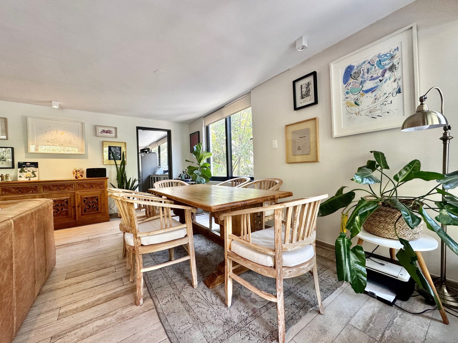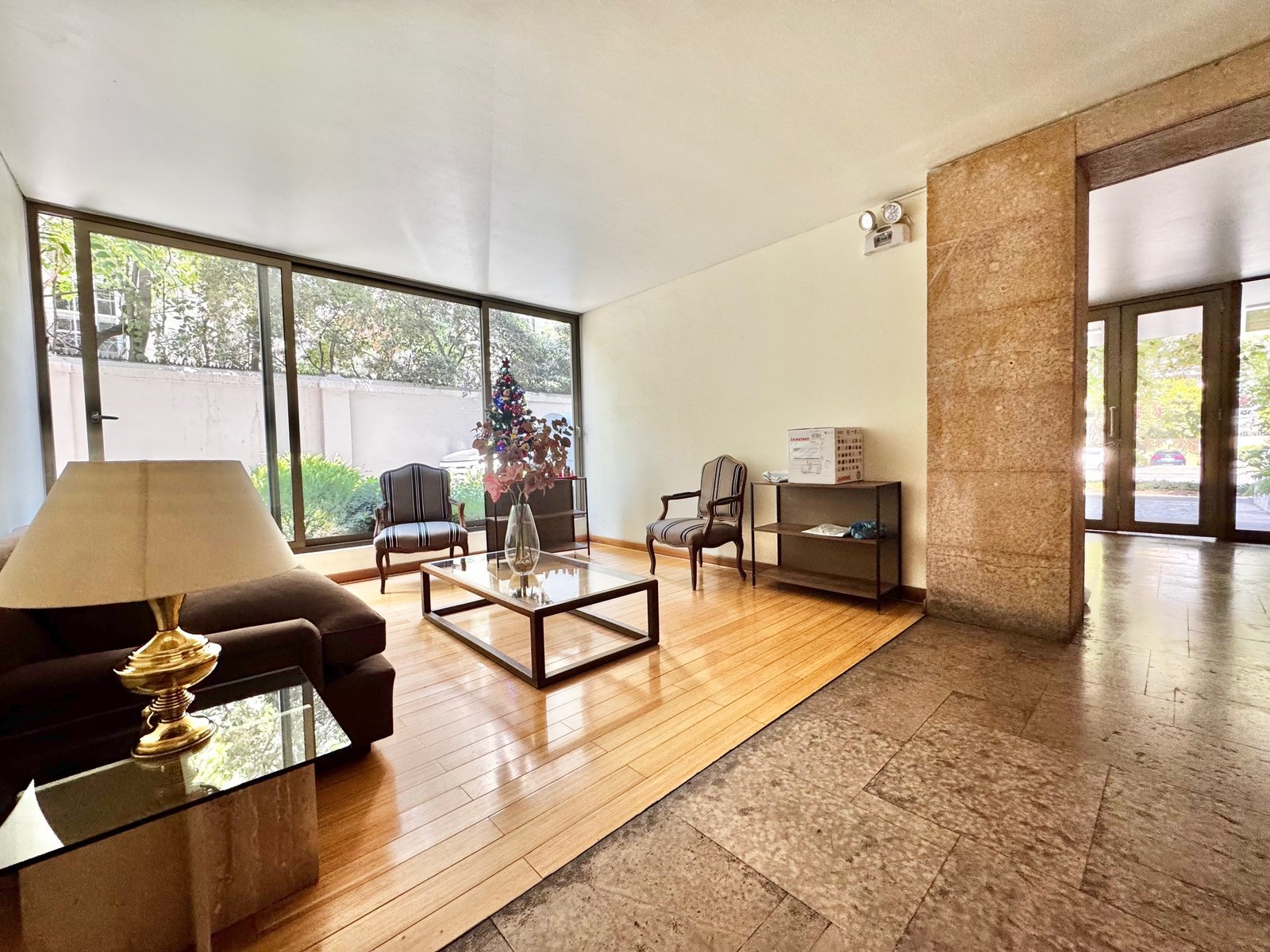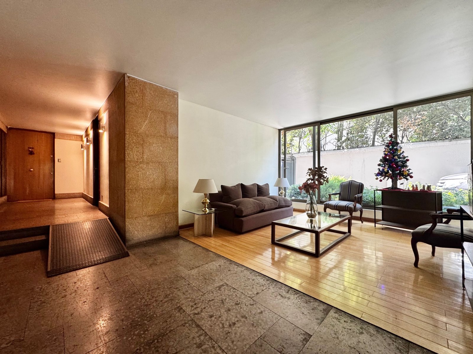 Entramos por hall de distribución y conectamos con amplia sala living y comedor juntos con orientación sur-poniente y salida a terraza con vista a lindos árboles. Aire acondicionado.