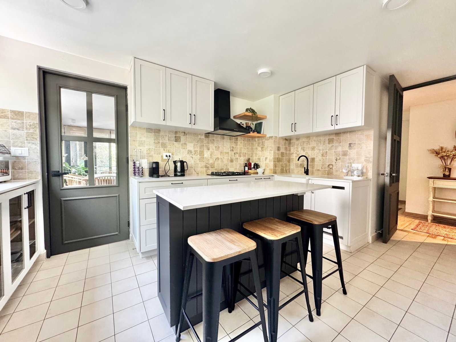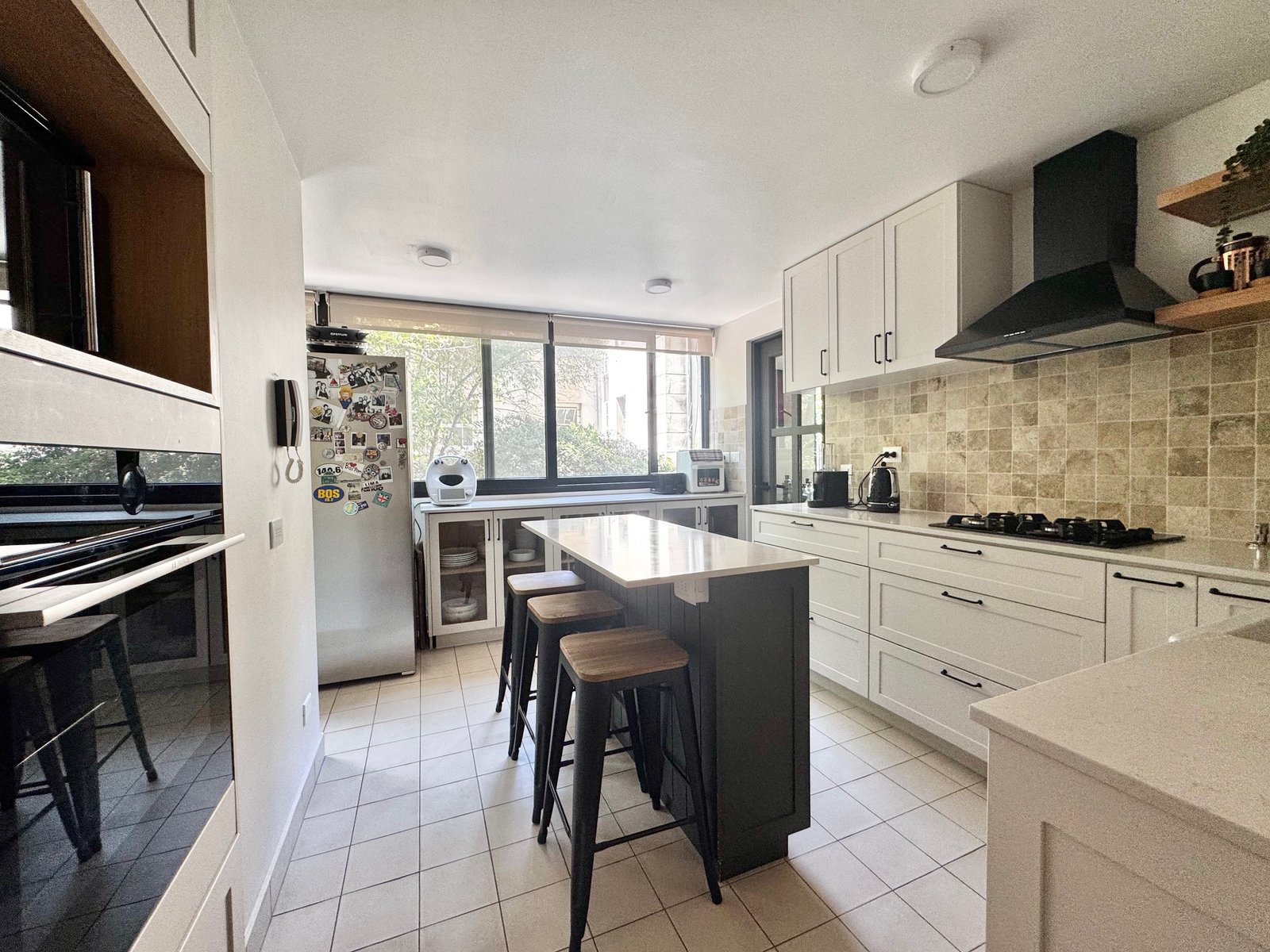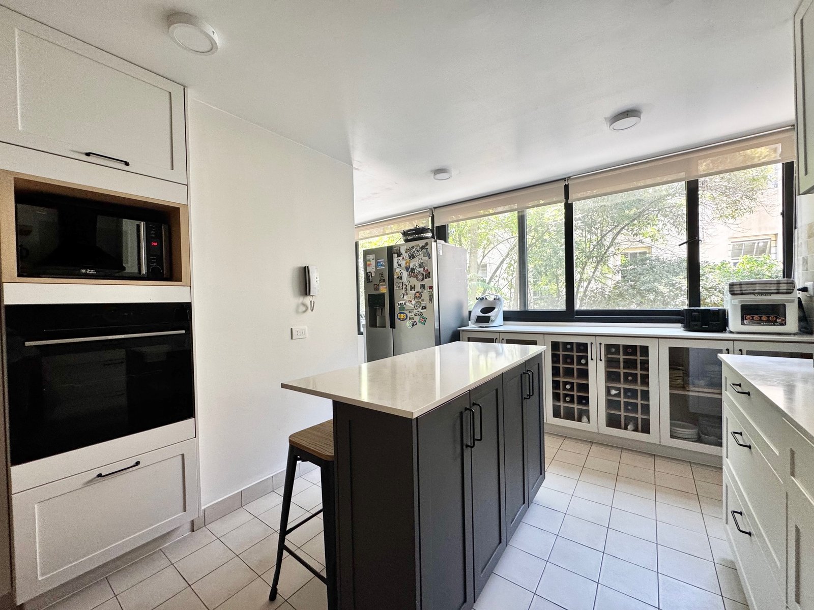 Cocina muy moderna, totalmente nueva, con comedor de diario o mesón isla, además de logia y dormitorio de servicio con baño.