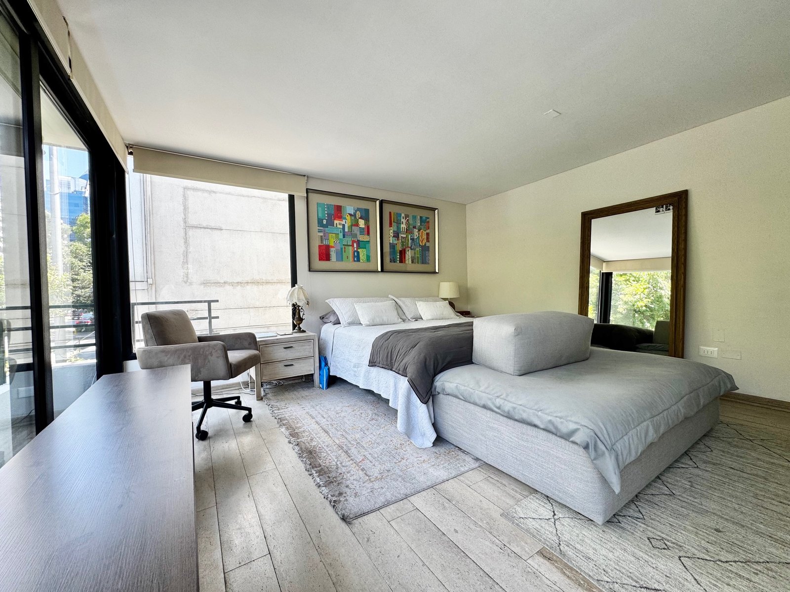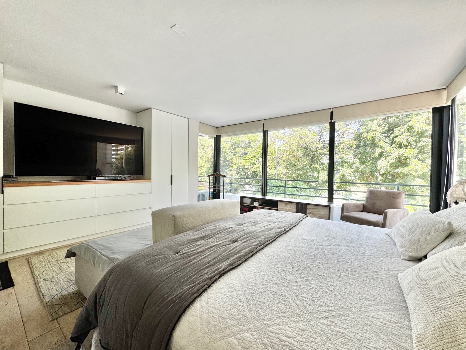 Pasamos a sector de dormitorios y encontramos un amplio dormitorio principal con closets totalmente nuevos, con buenos espacios, baño remodelado, rollers sunscreen y blackout. Además de roller en terraza del dormitorio principal con control remoto.